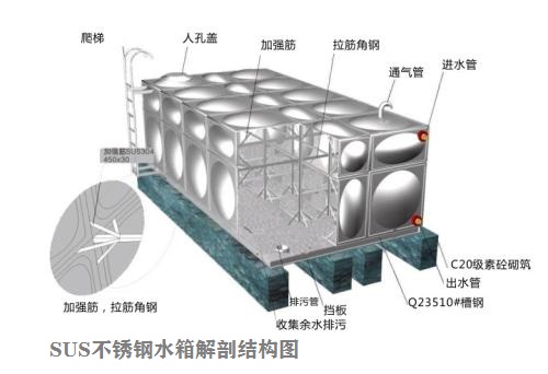 斯尤斯选用进口不锈钢SUS304的不锈钢水箱专用板,符合国家OCr18Ni19卫生检验标准,不生锈,不长青苔,不漏水、永久保持清洁卫生,安全稳固,使用寿命是混凝土水箱的15倍以上,并可适用于冷水、净水、开水、化学品、溶剂等储存。SUS愿与业界各客户真诚合作到永远。